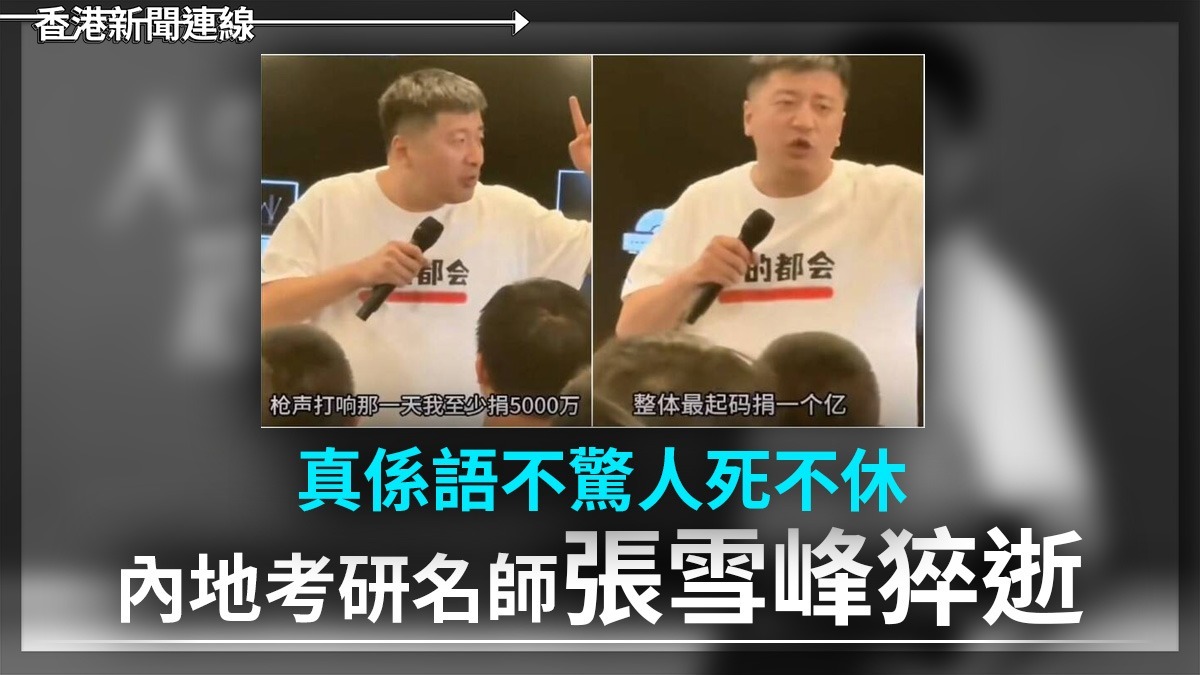 真係語不驚人死不休 內地考研名師張雪峰猝逝 內地教育界「頂流」網紅、以毒舌拆解升學就業見稱嘅考研名師張雪峰,尋日(24日)驚傳喺蘇州猝逝,終年 41 歲。其創辦嘅教育公司「峰學蔚來」喺尋晚深夜正式發出訃告,證實張雪峰因「心源性猝死」,經全力搶救後不治。消息一出,隨即衝上微博熱搜榜首,閱讀量喺短短幾個鐘內突破 30 億次,震撼成個內地互聯網。 據了解,事發喺 24 日中午。平時熱愛跑馬拉松、經常喺社交平台「打卡」跑步紀錄嘅張雪峰,當日喺公司健身室運動之後突然覺得胸口不適。未幾,佢就出現心臟驟停徵狀,隨即被送往蘇州大學附屬醫院。有目擊者影到,當時張雪峰躺喺擔架上面,雙眼緊閉,醫護人員瘋狂推車衝入急救室。可惜,雖然醫療團隊用盡全力,最終仍喺下晝 3 時 50 分宣告「回天乏術」。 張雪峰生前曾喺直播間開玩笑話:「如果有一日我死咗,熱搜一定係『張雪峰去世』,我希望成為一代人嘅記憶。」點知呢句「豪言」竟然一語成讖,令無數學生同家長唏噓不已。 張雪峰之所以紅遍全國,係因為佢敢於打破教育界嘅「糖衣包裝」。佢最出名嘅觀點係主張窮人家孩子報考大學應該以「就業」為唯一導向。佢曾經喺直播中直言:「文科係咩?文科即係服務業,總結成一個字就係『舔』。」 呢番言論當時引起軒然大波,多間大學教授出面痛斥佢「功利」、「扼殺理想」。但對於好多基層家庭嚟講,張雪峰係唯一一個肯講真話嘅人。有網民留言:「教授講理想係因為佢哋有鐵飯碗,張老師教我哋點樣喺現實社會生存,佢係我哋窮仔嘅引路燈。」 除了教育觀念,張雪峰嘅愛國言論亦經常成為話題。佢曾喺一次演講中情緒激昂咁表示:「祖國統一戰爭槍聲響嗰刻,我至少捐5000萬。公司帳面永遠有呢筆錢,整體起碼捐一億!」呢番熱血表態令佢收穫大量「愛國粉」,亦令佢喺內地政經界嘅影響力進一步擴大。 然而,人紅是非多。佢近年亦因為高額嘅志願填報諮詢費(傳聞一對一諮詢收費過萬)而被質疑係「割韭菜」。但無論評價點樣兩極化,佢嘅離去無疑標誌住一個「草根逆襲」偶像嘅隕落。 對於 41 歲正值壯年就猝然長逝,網上討論非常熱烈。有唔少人認為張雪峰係「過勞死」,因為佢一年 365 日幾乎日日直播,仲要打理公司、全國巡演,體力透支極大。 「佢幫咁多人揀咗最好嘅出路,但最後冇幫自己揀一條長命啲嘅路。」一位學生喺張雪峰嘅微博下留言。亦有網民感慨,張雪峰一生追求「效率」同「結果」,連離開都快到令人措手不及。